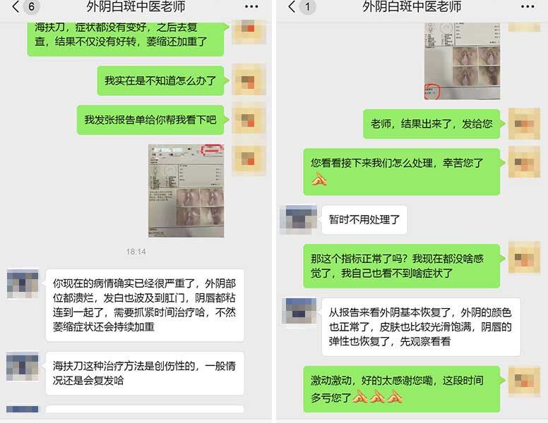说实话经历了海扶刀手术后,我就有点放弃的念头了,好在一次我去医院复查候诊的时候,遇到个大姐说她是去找的一个中医老师治好了她的外阴白斑,3年了都没有复发,现在就是每年复查一下就可以了,听到这里我也是很想去找这个老师,大姐说不用,因为这个老师长期做网络义诊,不用花挂号费就能在微信上咨询,她给了我老师的微信,我也分享出来老师的微信号是: (←点击复制),我加了微信后看了她朋友圈,有很多比我严重的外阴白斑病友都是用了老师的方法治好的。